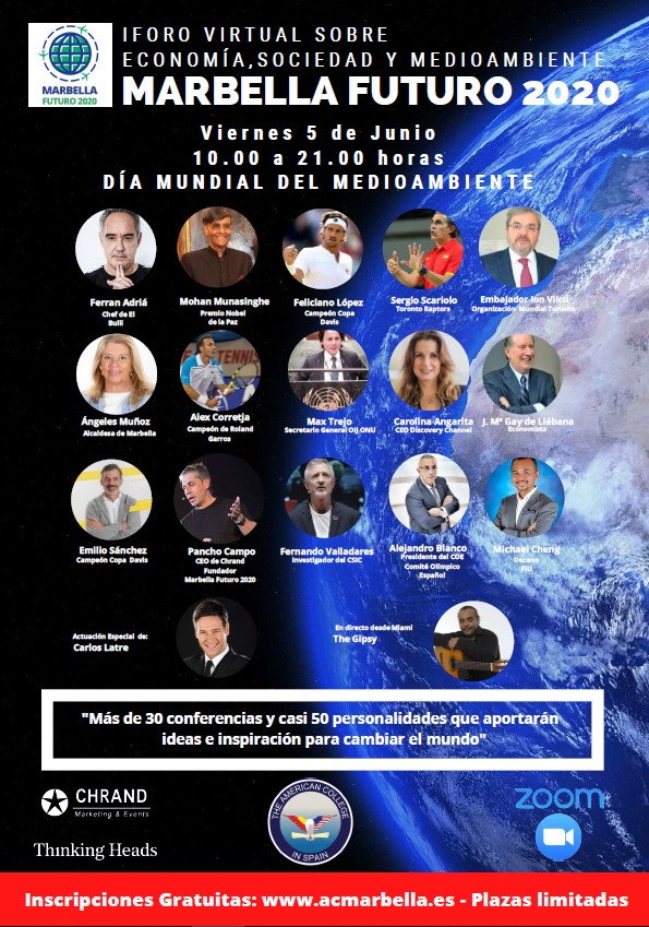 En un momento sin precedentes como el actual y con el objetivo de aportar ideas e inspiración a las empresas, a los autónomos y a la ciudadanía en general, The American College in Spain lanza MARBELLA FUTURO 2020, el primer foro virtual que tiene como objetivo exponer posibles soluciones al coronavirus, a la recesión económica y el medio ambiente, a través de conferencias impartidas por algunos de los referentes actuales, empresarios, deportistas y mentes brillantes. Marbella Futuro 2020 tendrá lugar de forma online el próximo viernes 5 de junio entre las 10:00 y las 21.00 horas.